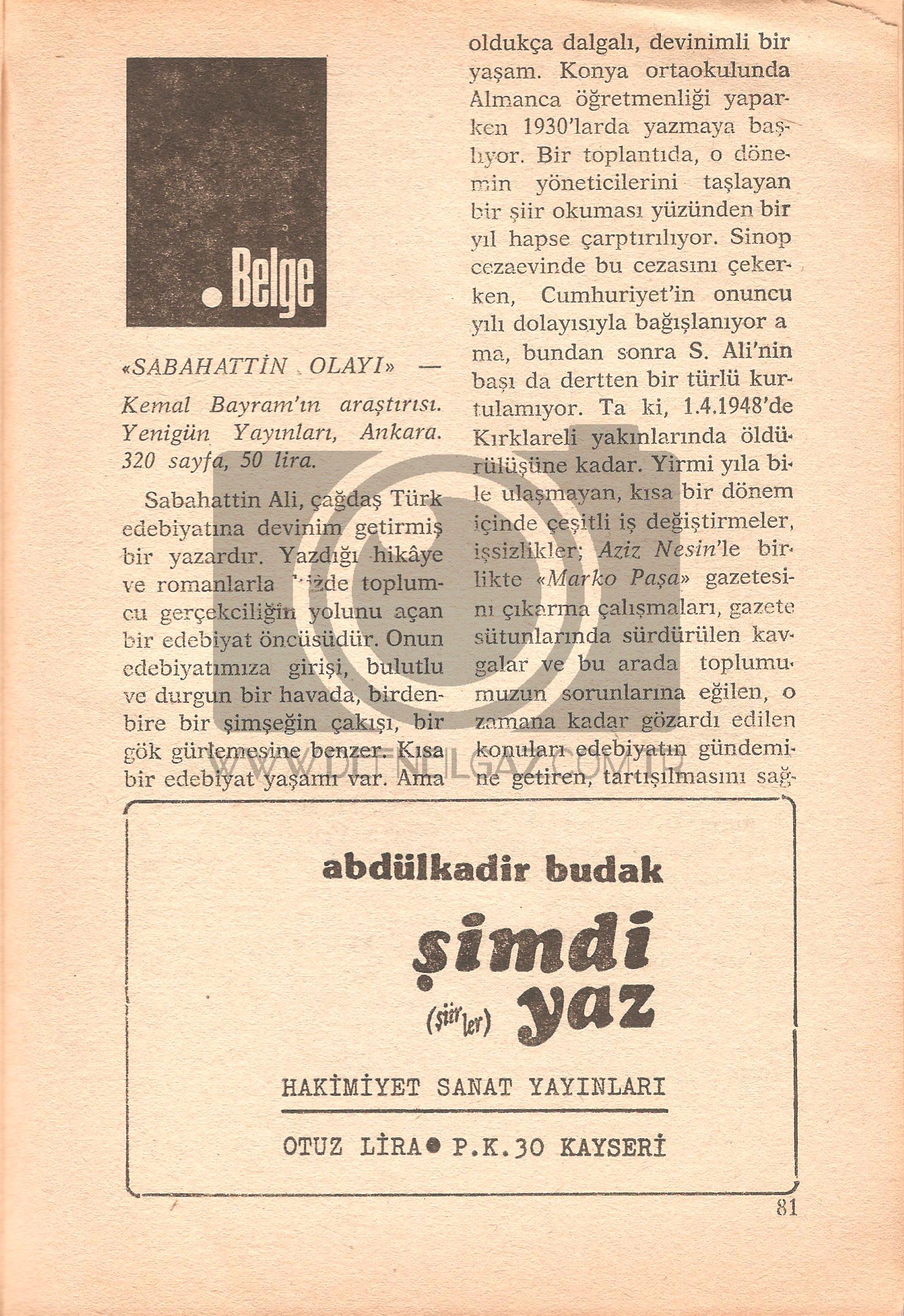 Eser HakkındaGÜNÜMÜZDE KİTAPLAR Aylık Dergi Sayı 2 Şubat 1980