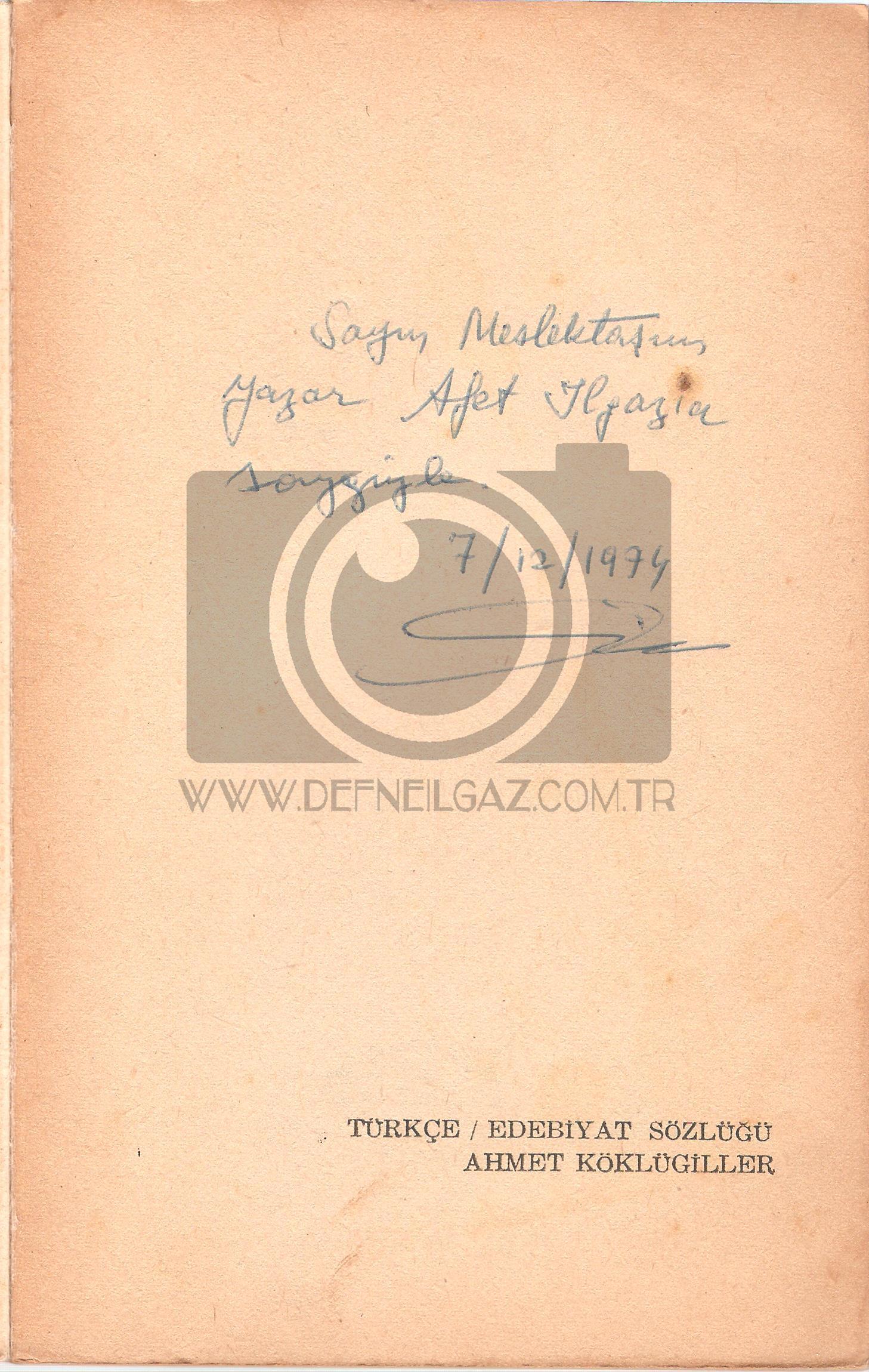 TÜRKÇE EDEBİYAT SÖZLÜĞÜ, AHMET KÖKLÜGİLLER, HÜR YAYINEVİ, 1974, Afet Ilgaz’a İmzalı